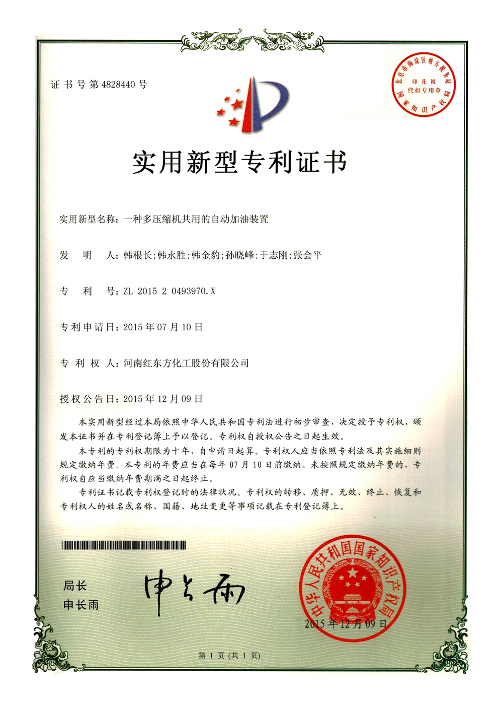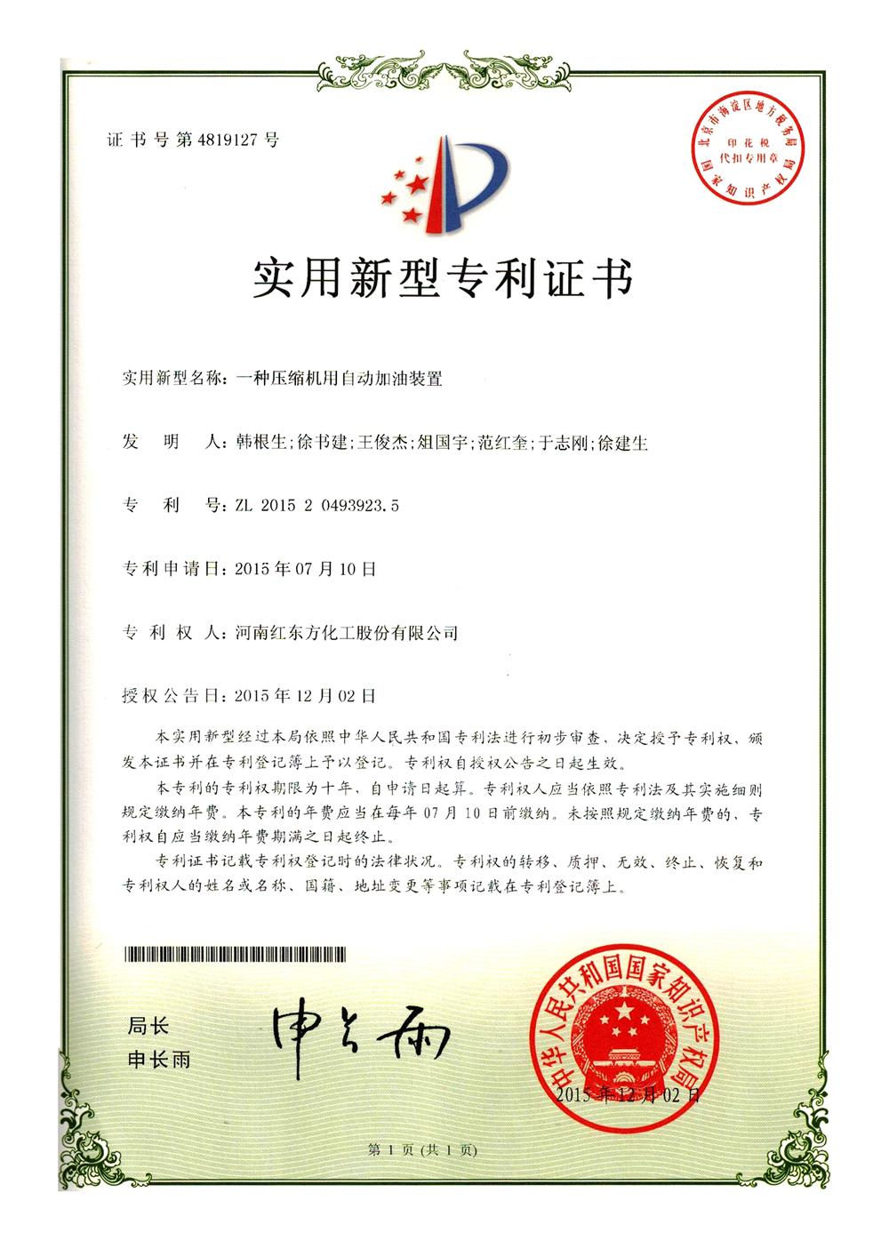 第4819127号 一种压缩机用自动加油