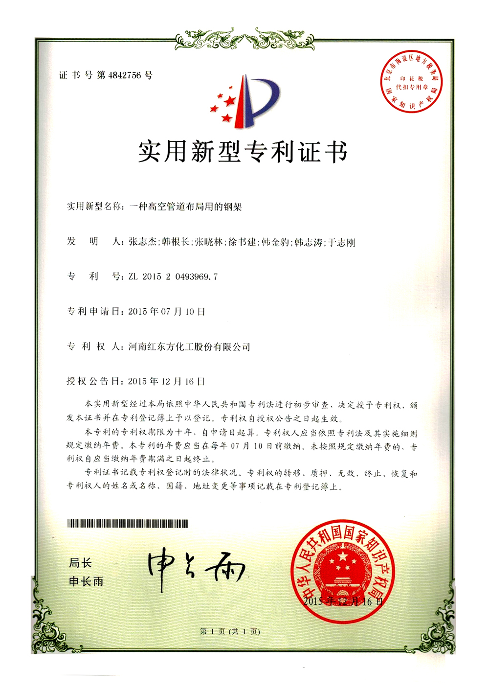 第4842756号 一种高空管道布局用的